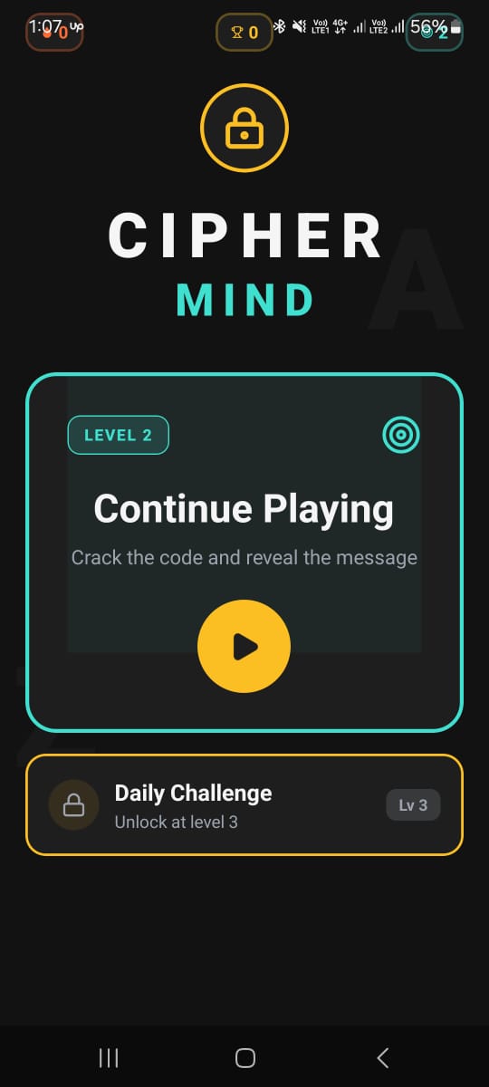 Cipher Mind is a brain-teasing puzzle strategy game designed to challenge logical thinking, pattern recognition, and problem-solving skills. Players progress through multiple difficulty levels, each introducing new mechanics and increasingly complex challenges. The game features a clean, intuitive UI and engaging mechanics that keep players coming back for more.